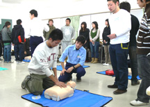 今回は「救急蘇生法」です。現在、一般市民への応急手当普及の重要性が強く主張されておりまして、消防・警察官に限らず、一般職であっても公務員には応急手当の心得が期待されているのが今日の情勢です。熊本市消防局や公ゼミの卒業生の指導のもと、みんな真剣にやってます。